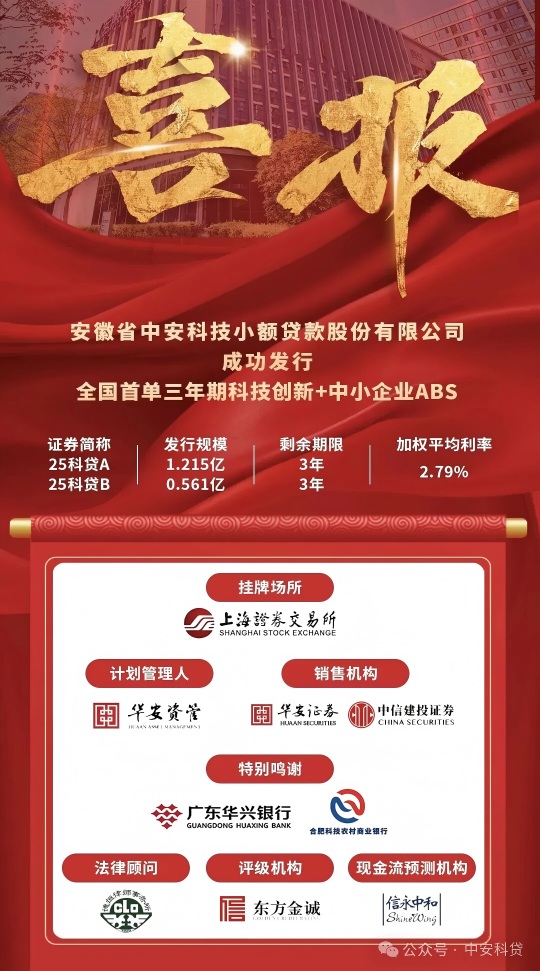 12月4日,安徽省中安科技小额贷款股份有限公司(以下简称“中安科技小贷公司”)作为原始权益人,在上海证券交易所成功发行中安科贷支持中小企业发展资产支持专项计划(科技创新)(以下简称“专项计划”)。专项计划发行规模1.87亿元,发行期限3年,加权平均利率2.79%。